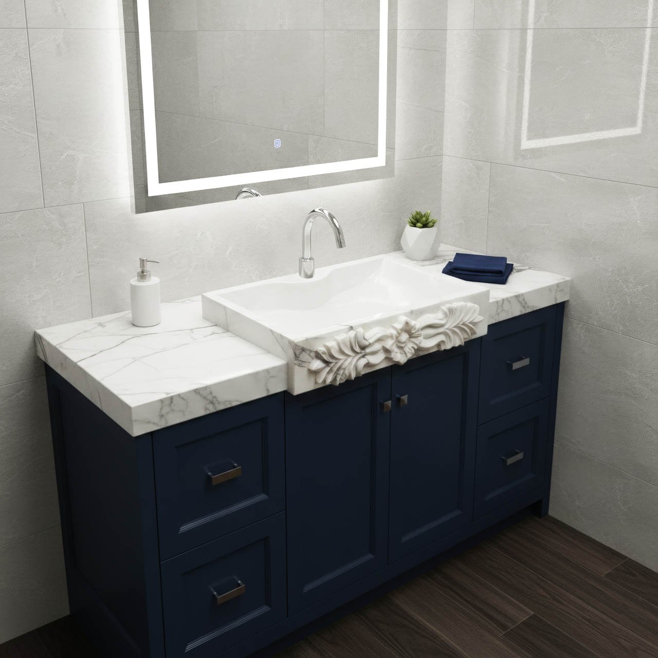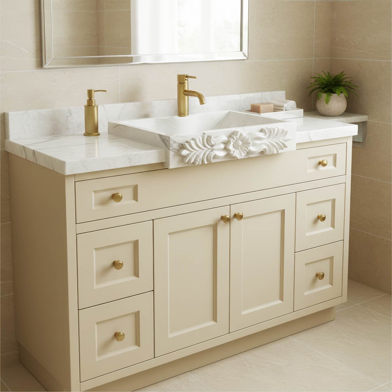 Miamivit Catherine Rosette Acanthus Lavabo, güzel el oyması detaylarıyla öne çıkan dikdörtgen, kap tipi bir lavabodur. “İnci” kaplama, mermerin doğal parlaklığını vurgularken ön kısımdaki “Acanthus” deseni klasik, Greko-Romen bir çekicilik katmaktadır.