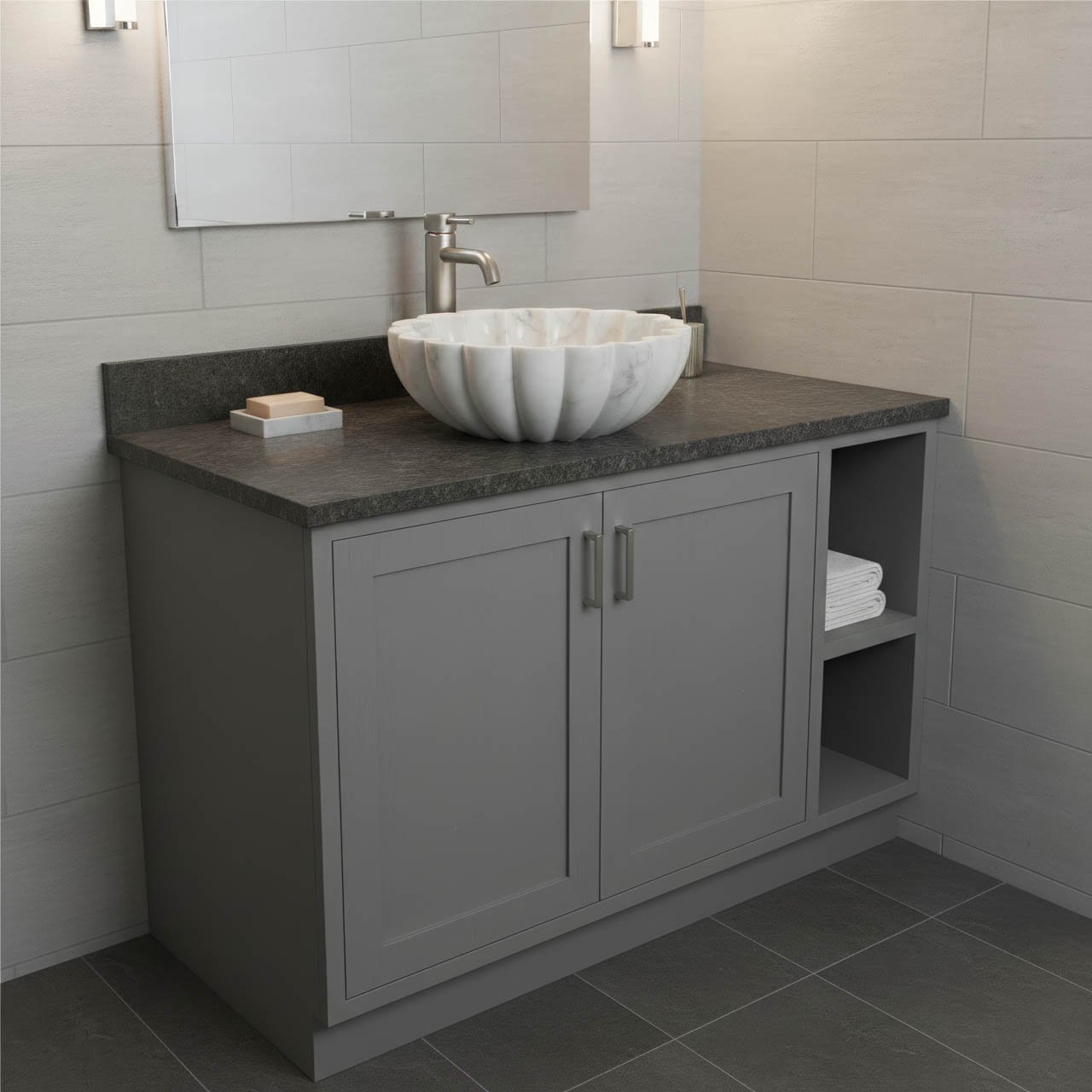 Bu tezgah üstü lavabo (tezgah üstü kurulum için tasarlanmıştır), lüks banyolara topraklanmış, "spa benzeri" bir ambiyans katmak için özel olarak üretilmiş, katı doğal taştan yontulmuştur.