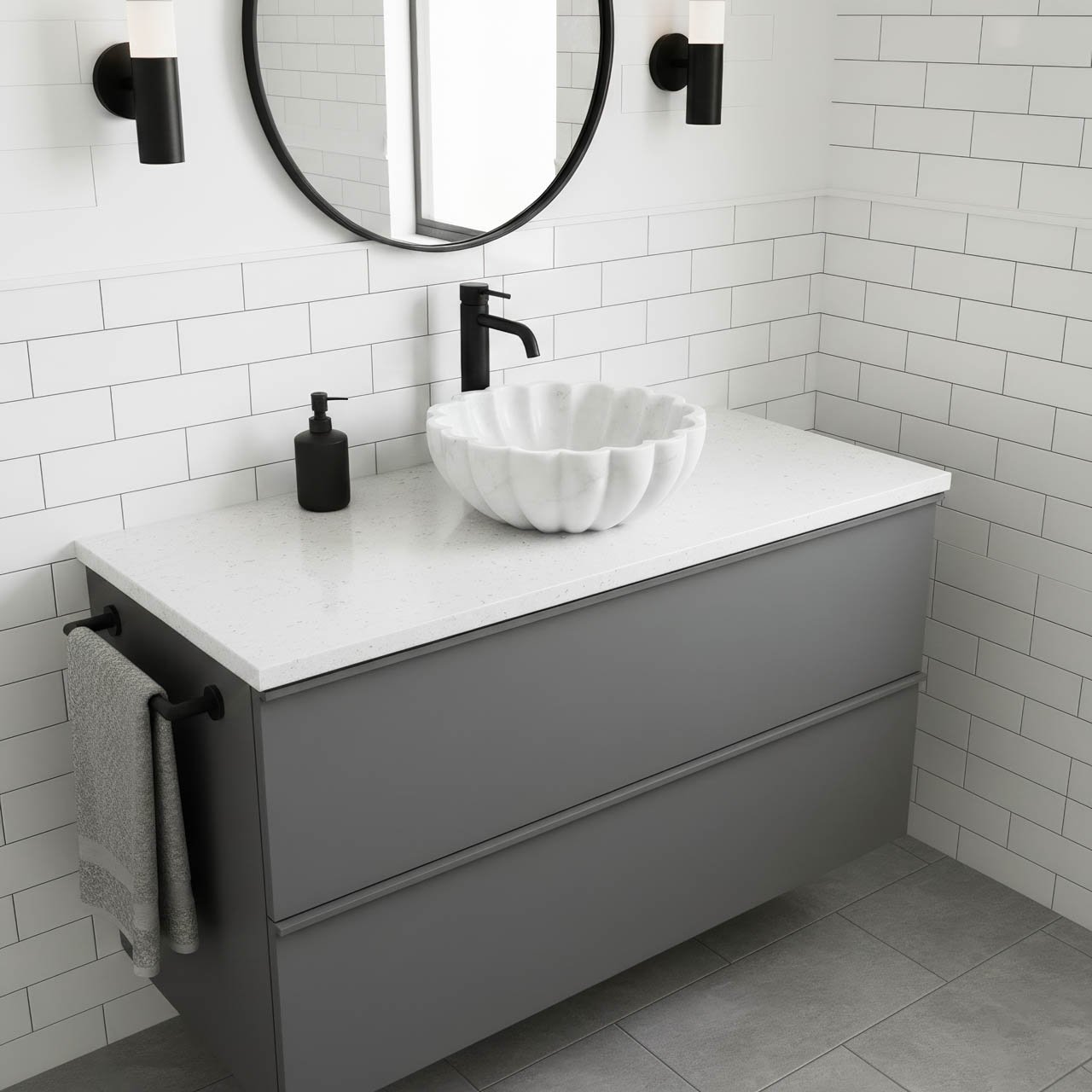 Form Faktörü: Tezgah üstü lavabo olarak tasarlanan bu ürün, gömme yerine tezgah üstüne yerleştirilerek heykelsi zarafetini vurgular.