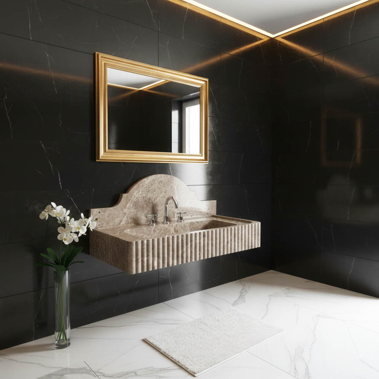 Regal Backsplash: The high, arched backsplash (reminiscent of Roman or Baroque silhouettes) not only protects your walls from water splashes but also serves as a bold decorative statement piece.