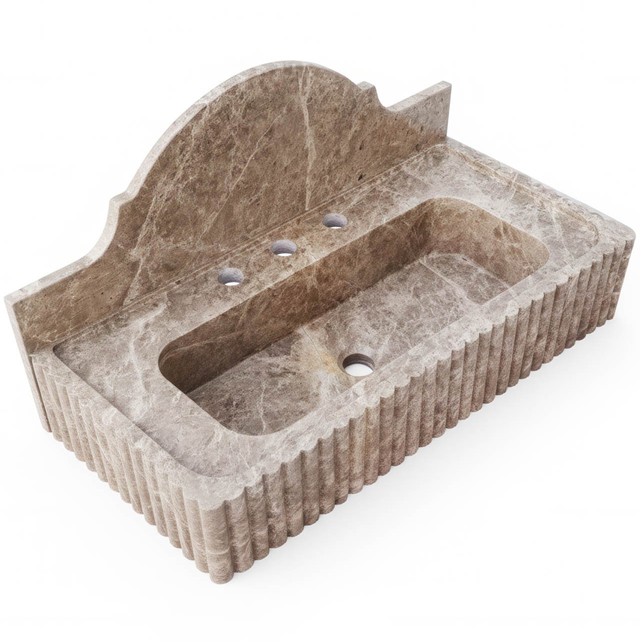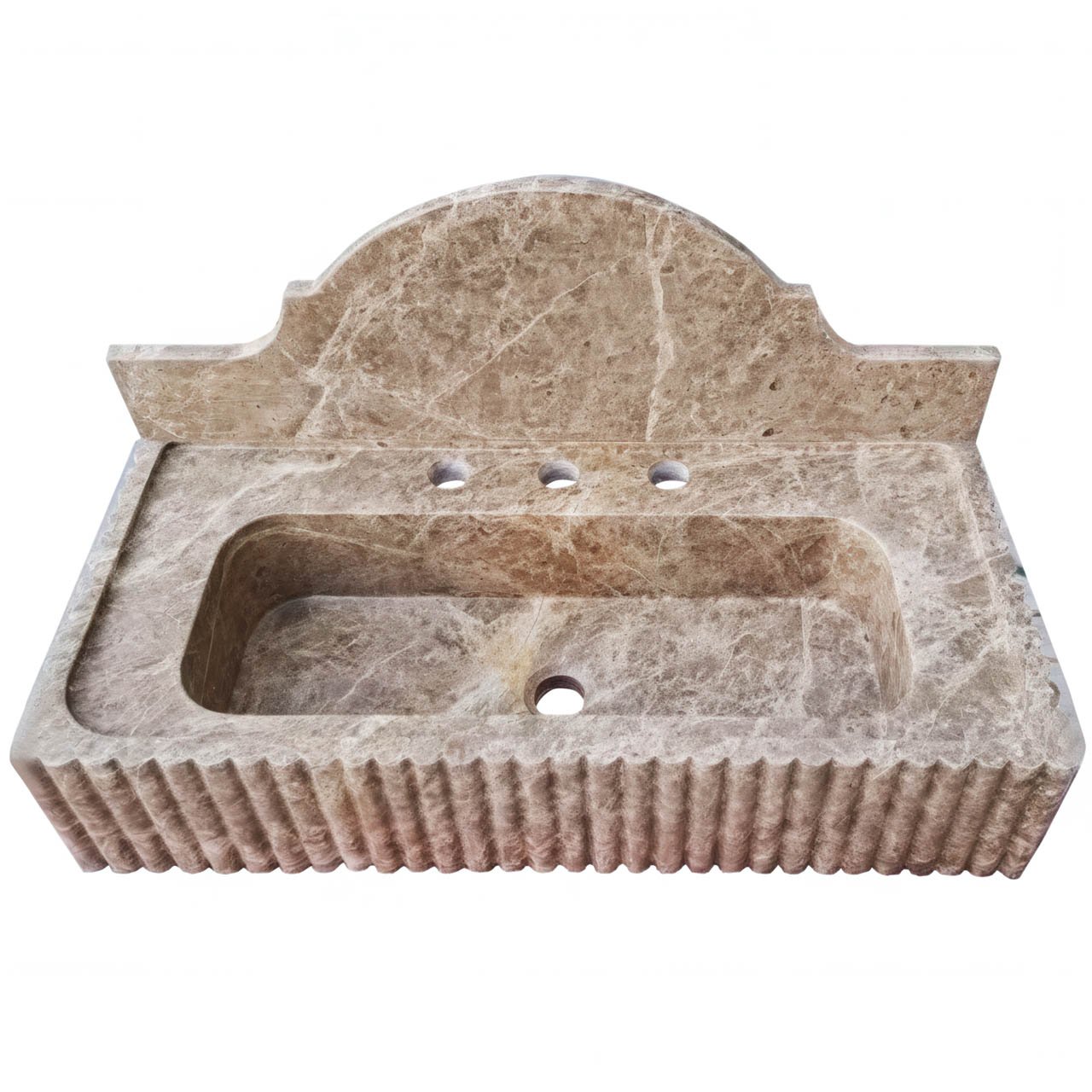 Configuration: Integrated backsplash with a curved pediment and pre-drilled holes for a three-piece faucet set.